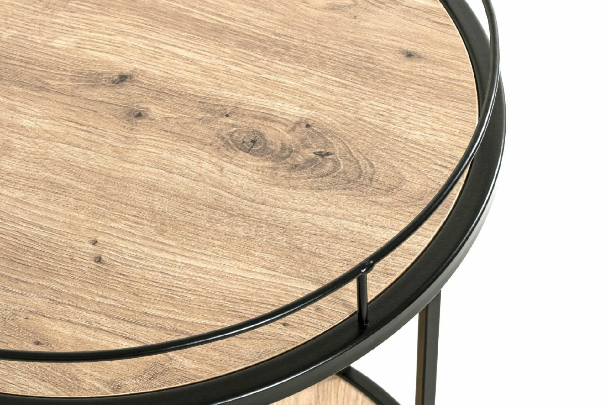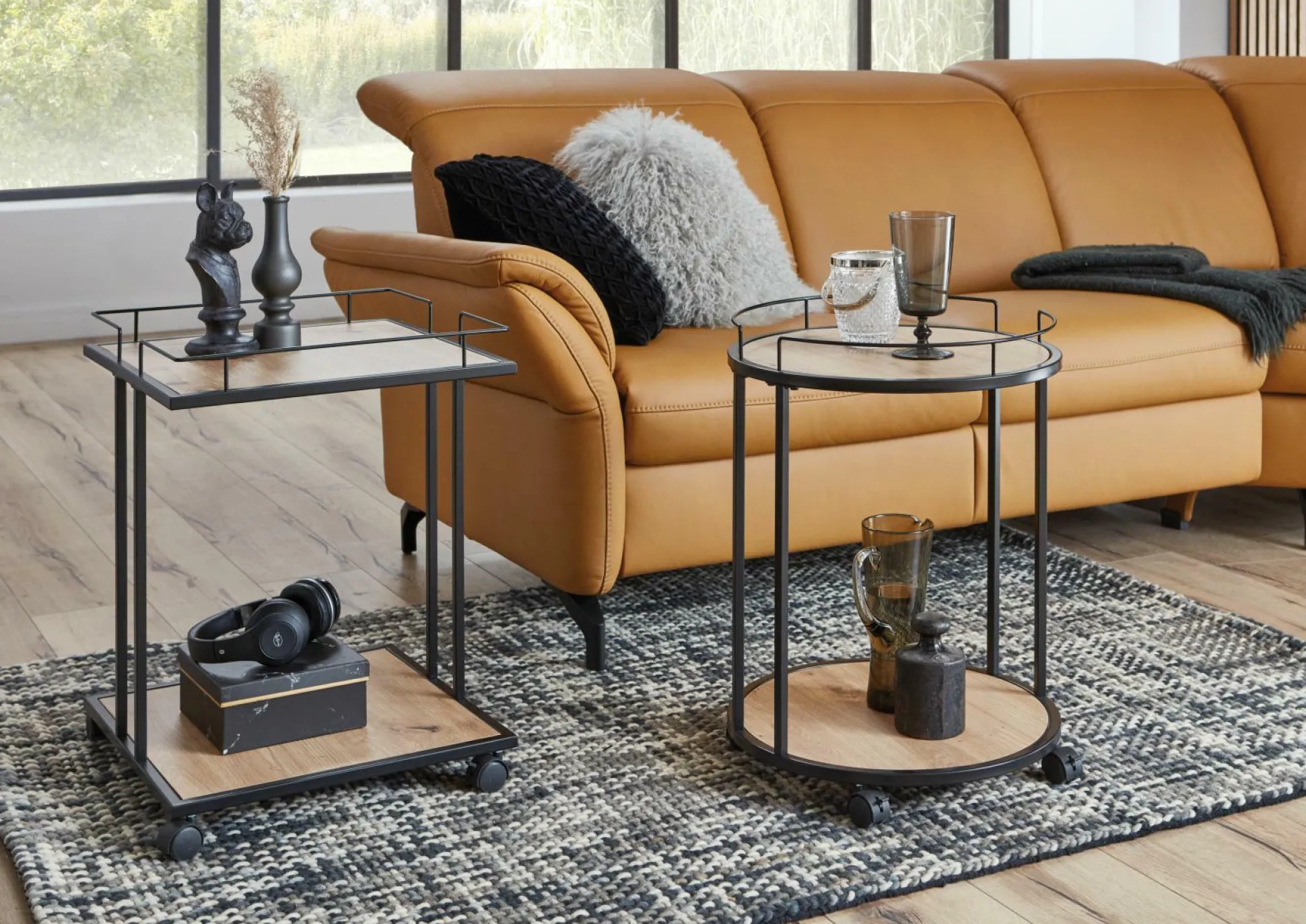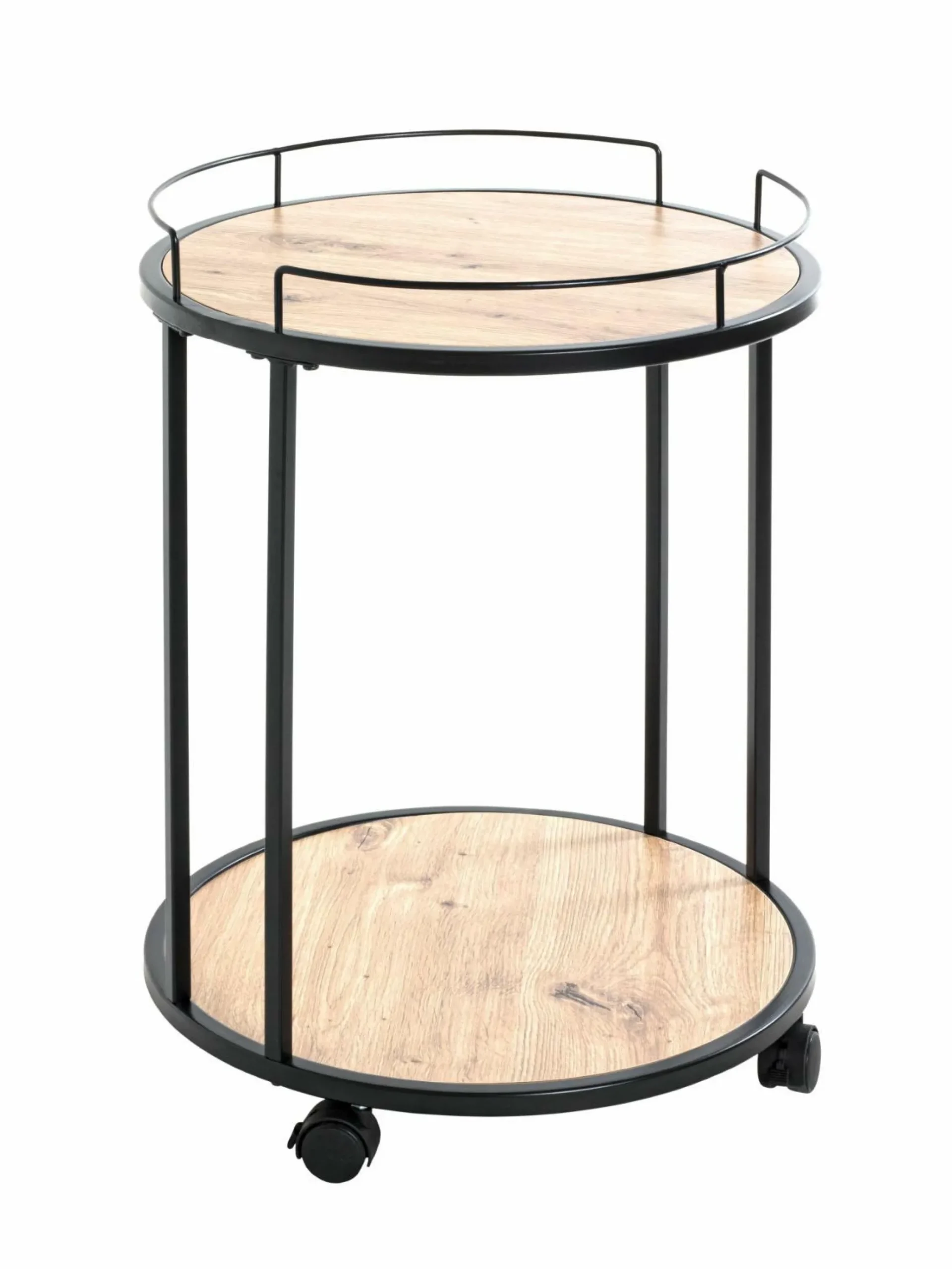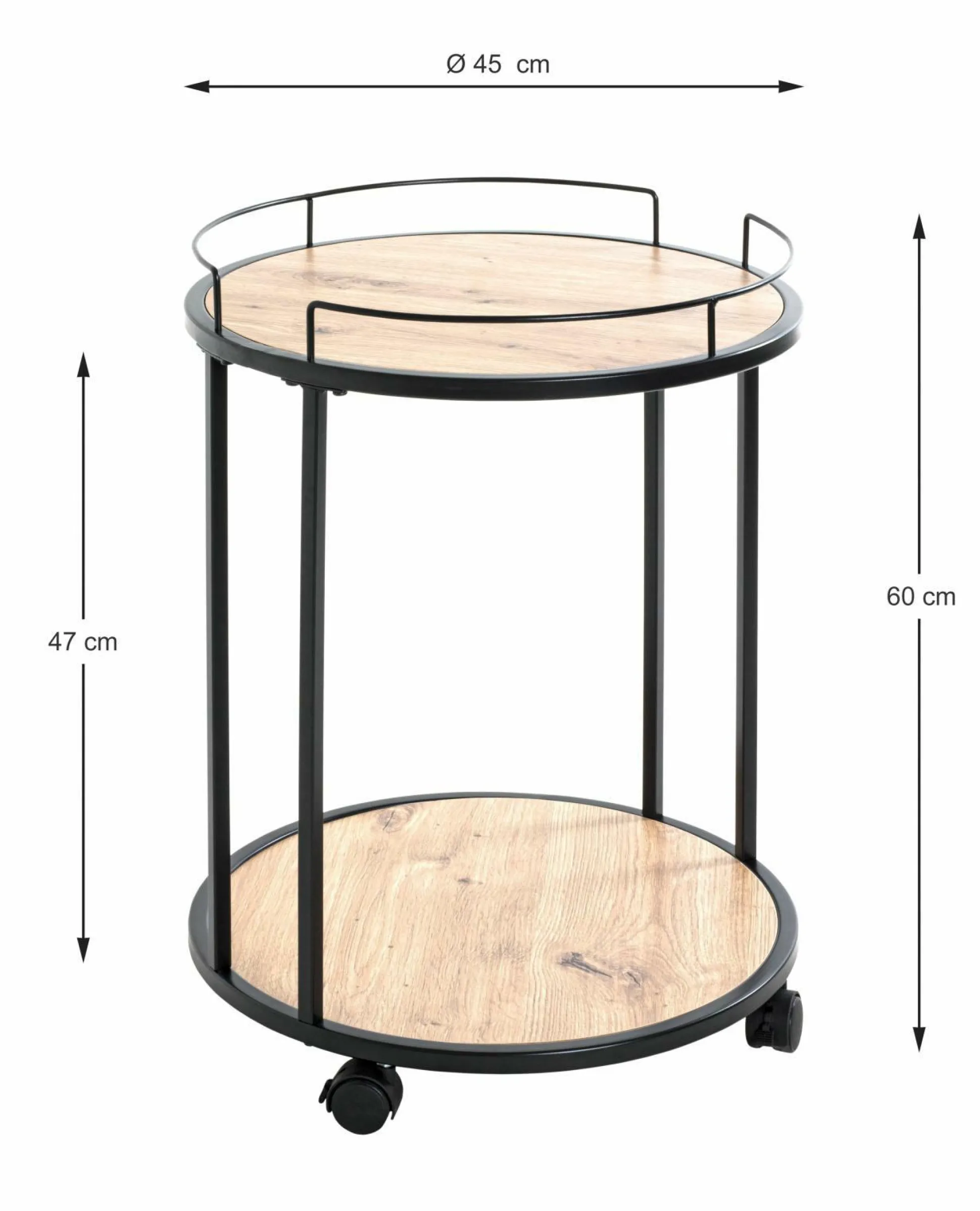 Mit diesem Beistelltisch schaffen Sie Ordnung in Ihrem Zuhause. Der kleine Begleiter ist besonders praktisch und lässt sich im Raum ideal und flexibel positionieren. Der Tisch ist aus schwarz lackiertem Stahlrohr gefertigt. Die Ablagen sind aus MDF Melamindekor Eiche und schaffen somit einen schicken Kontrast, der das Design perfekt abrundet. Der Tisch mit Rollen misst eine Zwischenhöhe von 47 cm. Eine Montage ist erforderlich.