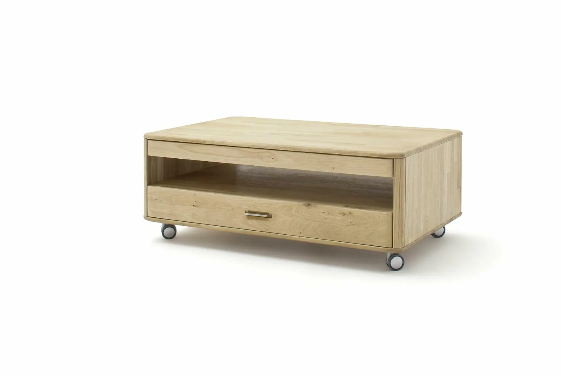 Der modische Couchtisch Ravello von MCA erscheint in heller Balkeneiche und bietet viel Platz für TV-Zubehör oder andere alltäglichen Dinge. Egal ob spannender Filmeabend oder genussvolles Abendessen, der Couchtisch hält was er verspricht. Erlaube Sie sich einen geschärften Blick auf die Tischplattenoberfläche, die mit einem sanften Öl bezogen ist.