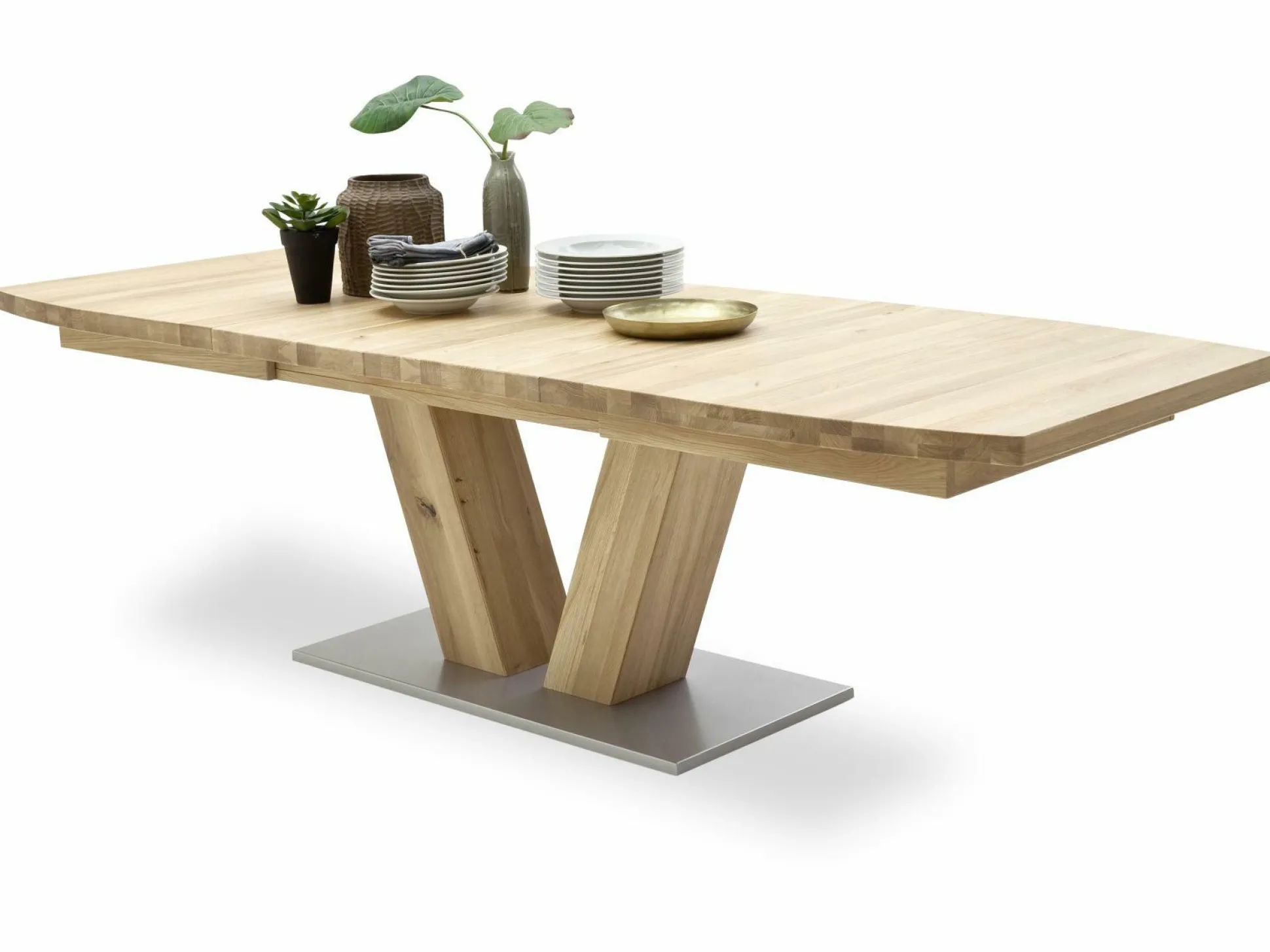 Eine besondere Form und tolles Material – der Esstisch Managua B überzeugt auf ganzer Linie! Insgesamt besteht der Tisch aus geölter Eiche Bianco massiv und präsentiert dadurch einen natürlichen, aber auch modernen Stil. Durch seine leicht abgerundete Bootsform und die beiden speziellen Tischbeine wird er in Ihrem Esszimmer zum Hingucker. Dabei ist der Tisch 140 cm breit und kann sogar nach Bedarf auf 220 cm ausgezogen werden. Nehmen Sie mit Ihren Liebsten Platz und genießen Sie leckere Mahlzeiten!