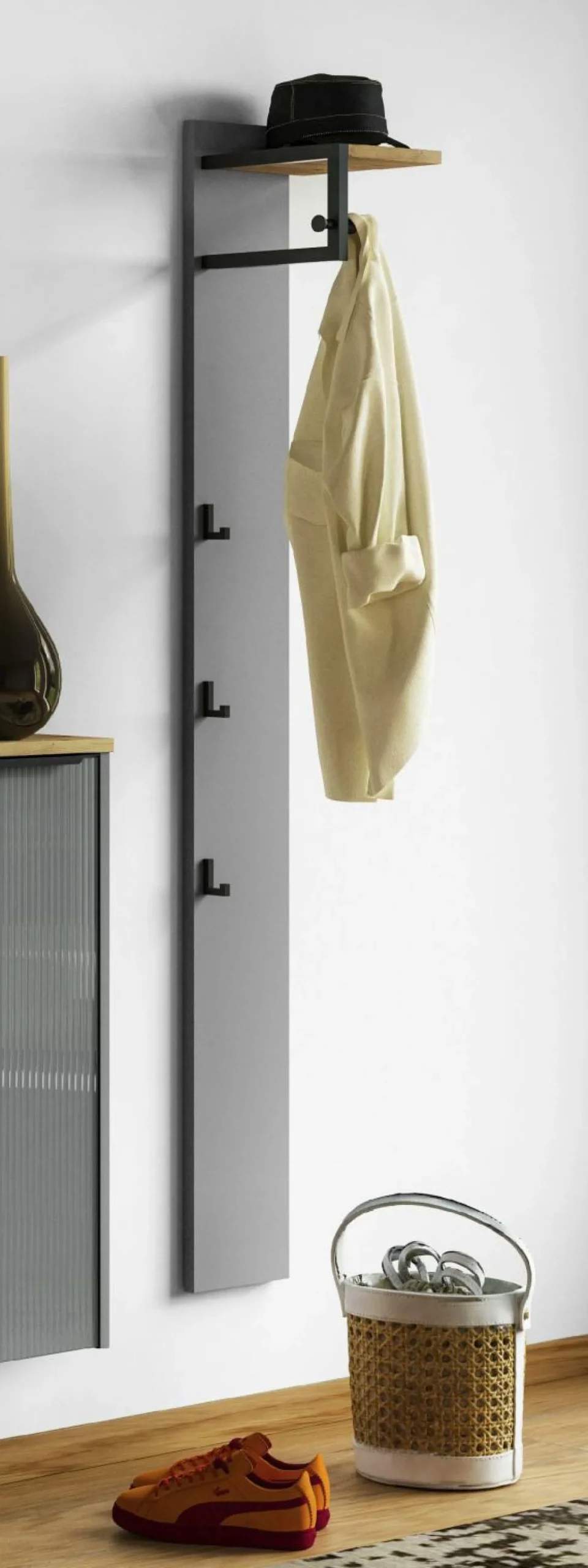 · mit einer Holz-Hutablage und drei Kleiderhaken (schwarz)