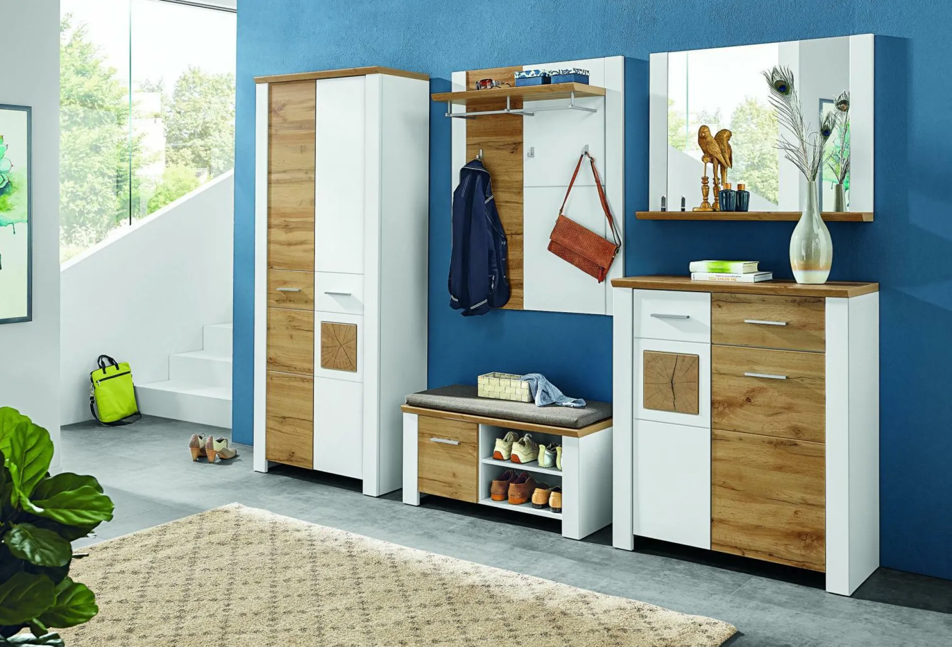 Front Lacklaminat weiß supermatt MDF perfect touch bzw. Eiche Altholz MDF Absetzung Hirnholz Nachbildung Korpus weiß matt, Absetzung Eiche Alt- holz Nachbildung, Griffe Kunststoff Chrom matt, Bez. graubraun meliert TKZ 100% Polyester Schubkasten Softclose, mit Selbsteinzug Türen mit Softclose Relingsystem Metall Chrom matt bestehend aus den Typen 01/11/43/50/60 — Nur Lieferung ohne Montage möglich, Ware komplett zerlegt —, Materio