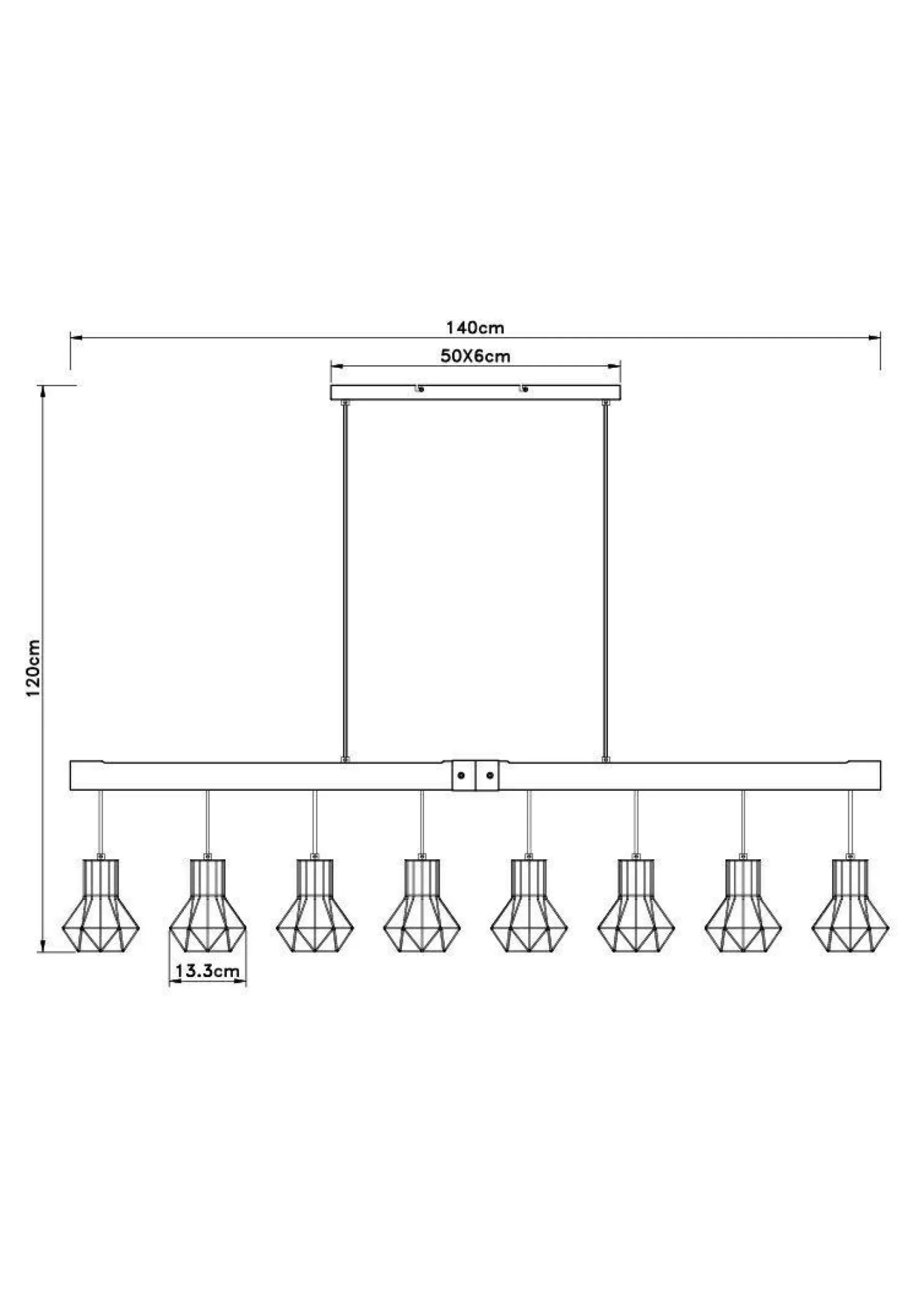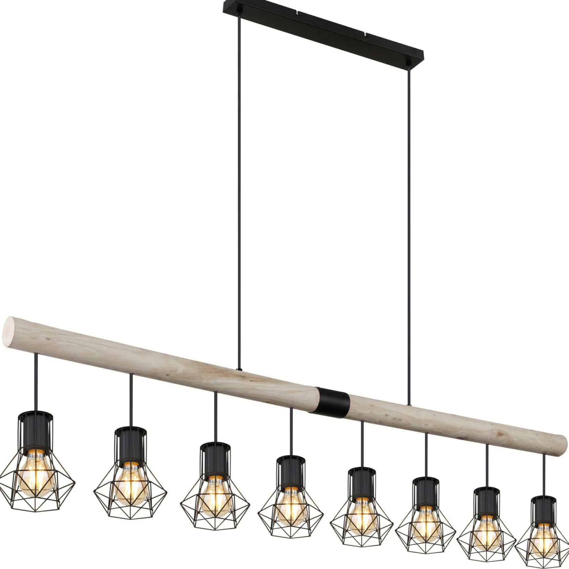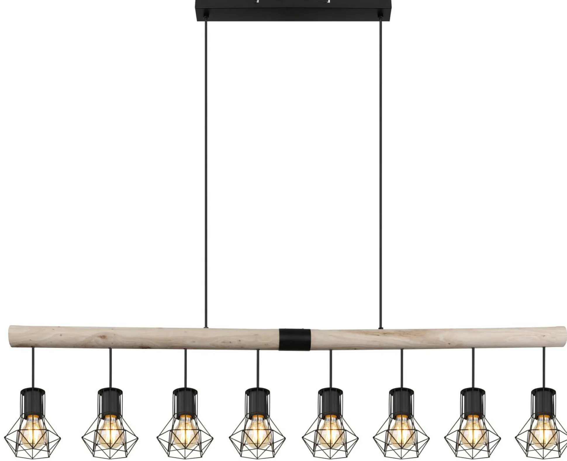 · Diese tolle Hängeleuchte begeistert durch schönes Design. Aus einer rechteckigen Deckenbefestigung ragen zwei Kabel und münden an einen Holzbalken mit einer Länge von 1,4 m, an diesem sich acht E27 Fassungen mit jeweils einem Schirm mit Metallgeflechten befindet. Die E27 Fassungen ermöglichen Ihnen selbst, bis zu einer maximalen Leistung von 60, über Lichtfarbe und Helligkeit zu bestimmen.
