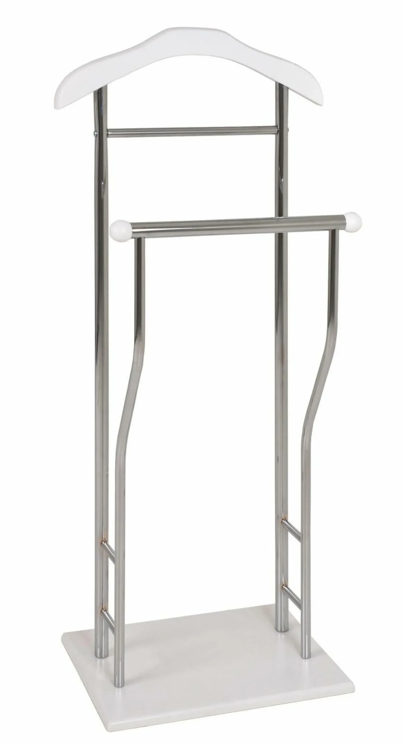 Der Herrendiener wurde aus einem verchromten Stahlrohr gefertigt. Sein Kleiderbügel und die Fußplatte bestehen aus MDF in weiß lackiert. Das dezente Design kann zu verschiedenen Einrichtungsstilen kombiniert werden. Zudem kann mit diesem Herrendiener jedes Kleidungsstück faltenfrei aufgehängt werden.
