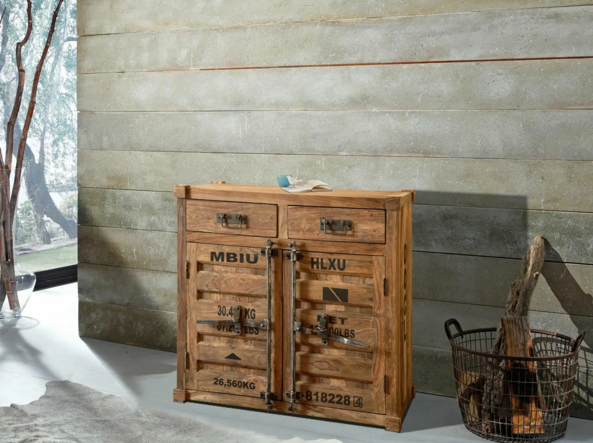 Die Kommode Container von Wolfmöbel begeistert mit einem schicken Look in Ihrem Wohnbereich. Das Element wurde aus Shishamholz gefertigt und begeistert mit Aufdrucken von Containern. Ein besonderes Highlight sind die Knäufe und Griffe. Hinter zwei Türen und zwei Schubkästen bietet Ihnen diese Kommode Platz zum Verstauen von Geschirr, Deko und vielen weiteren Sachen. Der Platz hinter den Türen wird durch einen Einlegeboden aufgeteilt. Das Möbelstück im mediterranen Landhausstil wird zum absoluten Hingucker in jedem Wohnbereich.