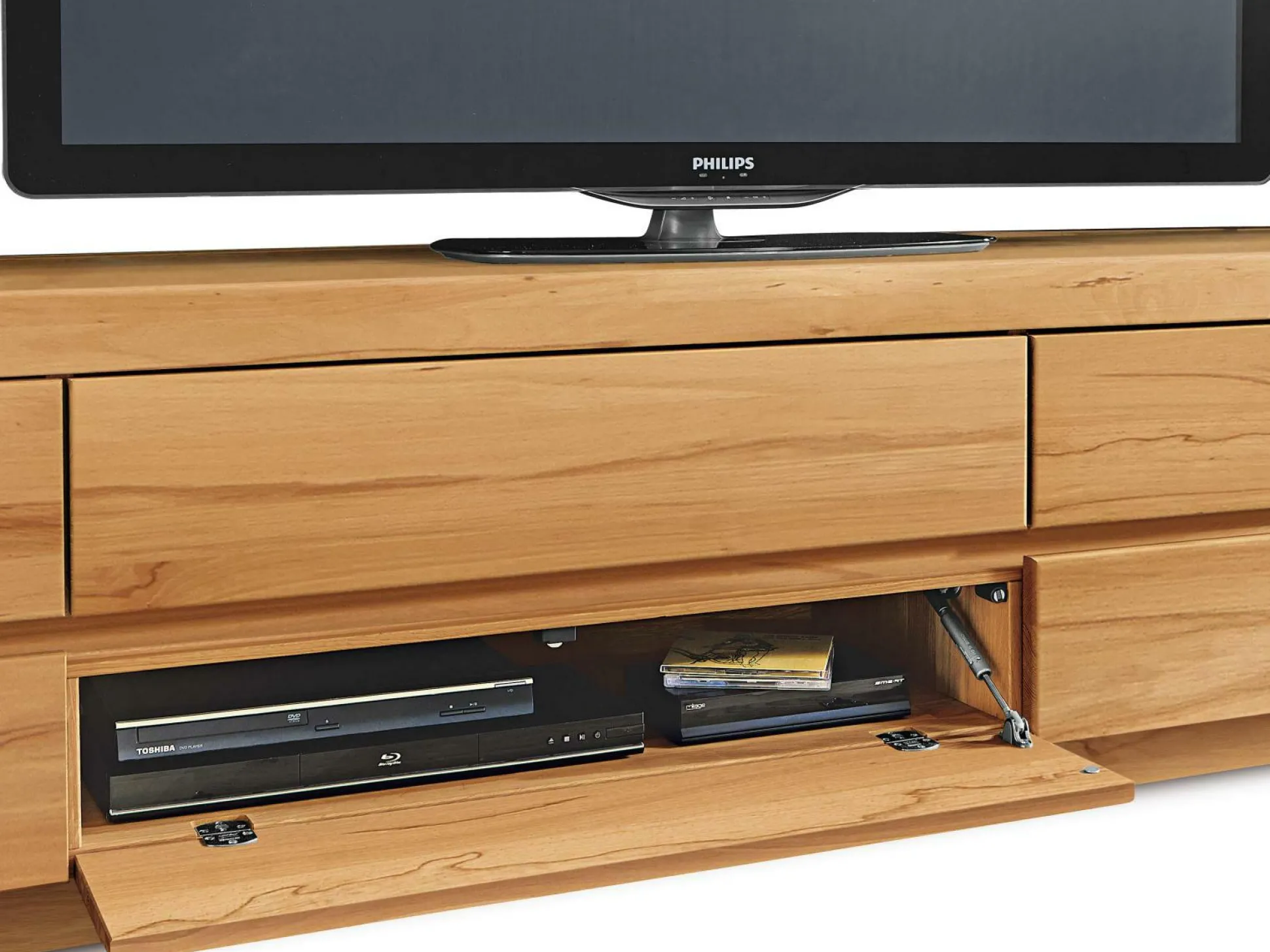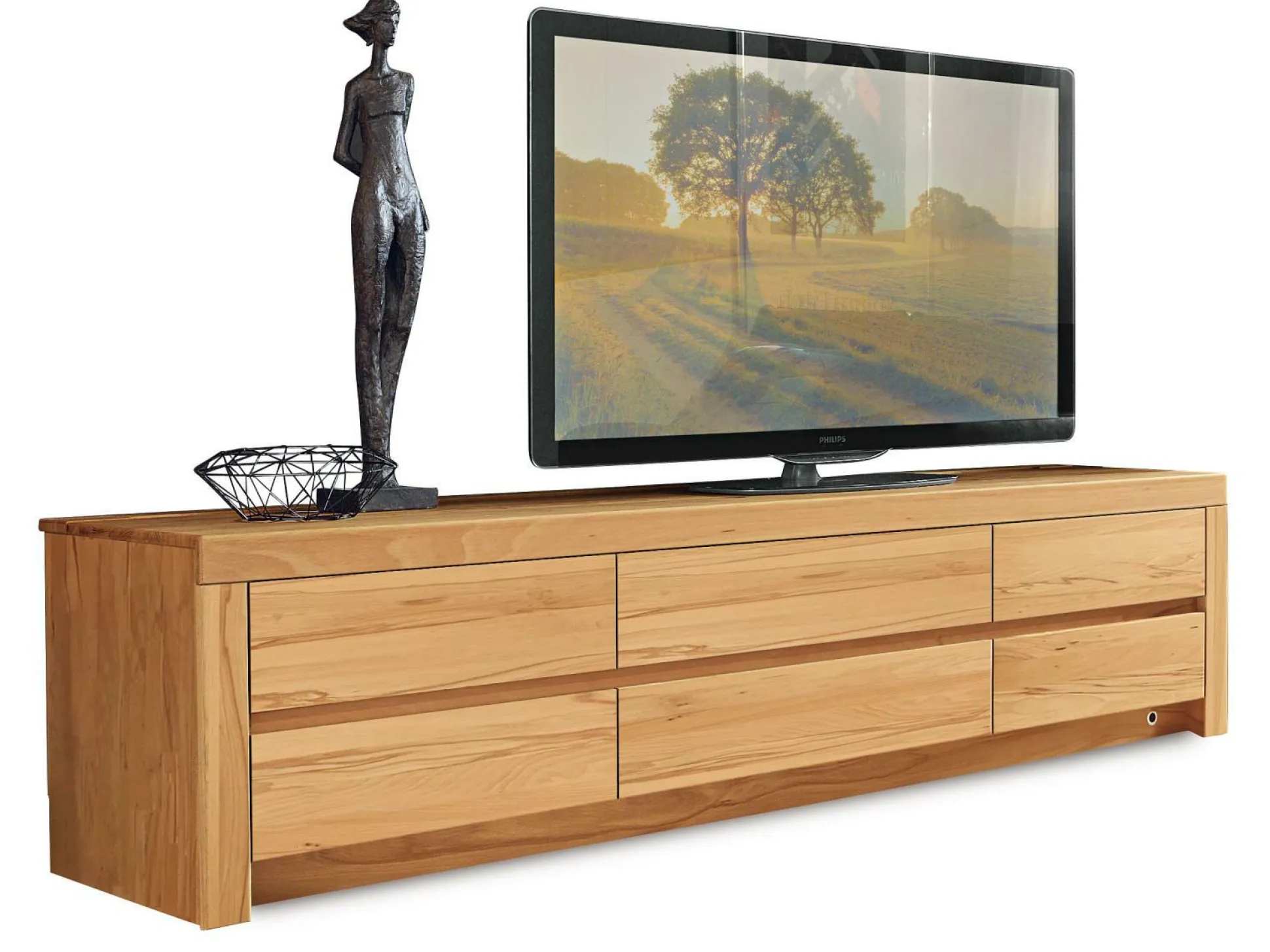 Mit dem Lowboard Soraga von witlake setzen Sie natürlich geschmackvolle Akzente im Wohnbereich. Klare Strukturen definieren das Element, das in die verschiedensten Stile integrierbar ist. In fünf Schubkästen und einer Medienklappe, unten mittig, findet sich in dem Lowboard ausreichend Staufläche für technische Geräte und Zubehör wieder. Das Möbelstück ist hochwertig verarbeitet und überzeugt mit seiner Gestaltung aus soft gebürsteter, massiver, europäischer Kernbuche.