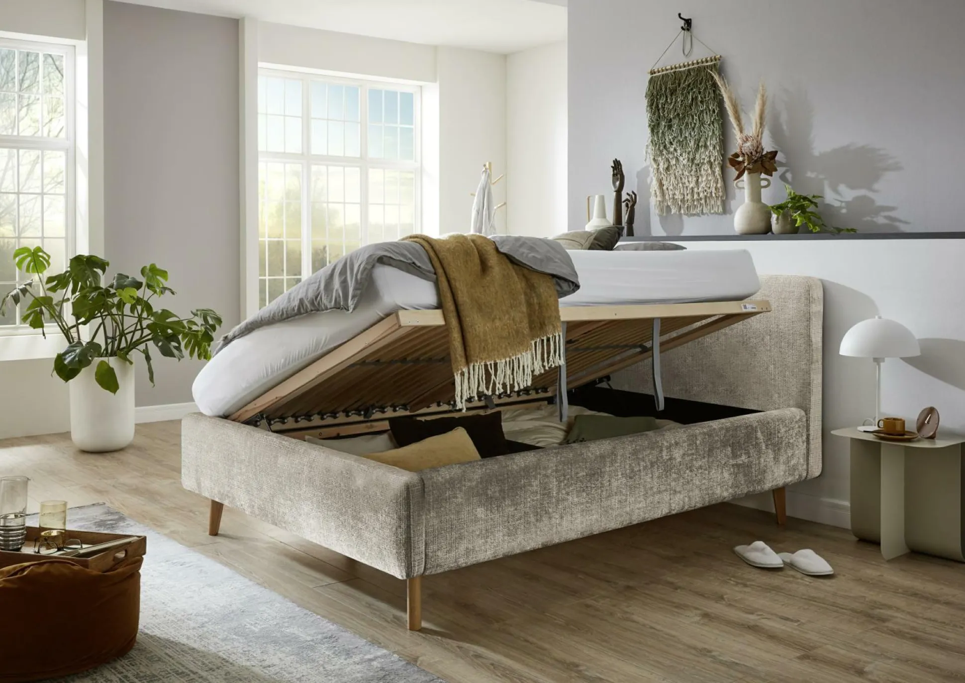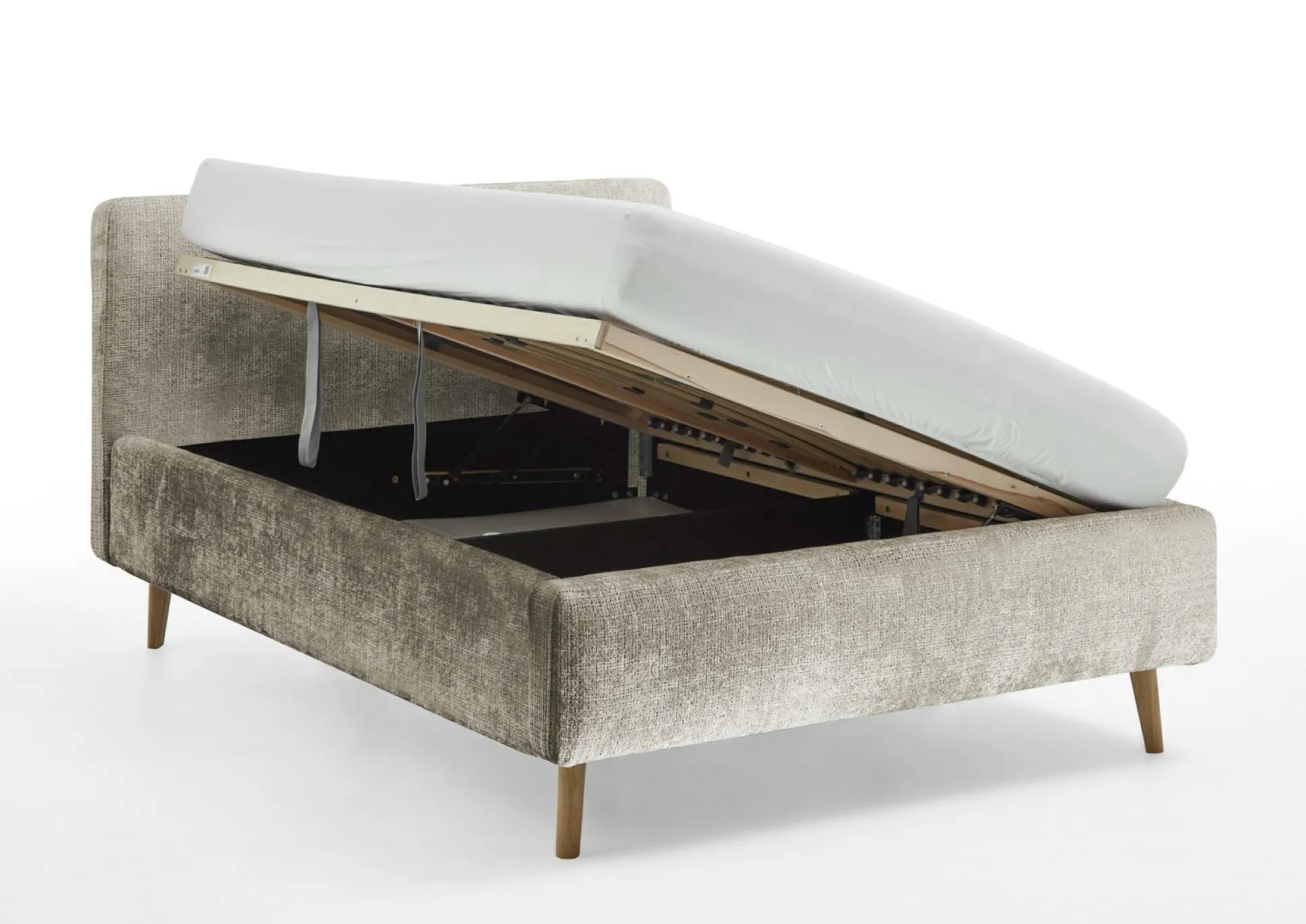 · Polsterbett mit glatten Kopfteil, inkl. belüftetem Bettkasten und seitlich zu öffnende Federholzrahmen, 28 Leisten starr mit Härtegradverstellung