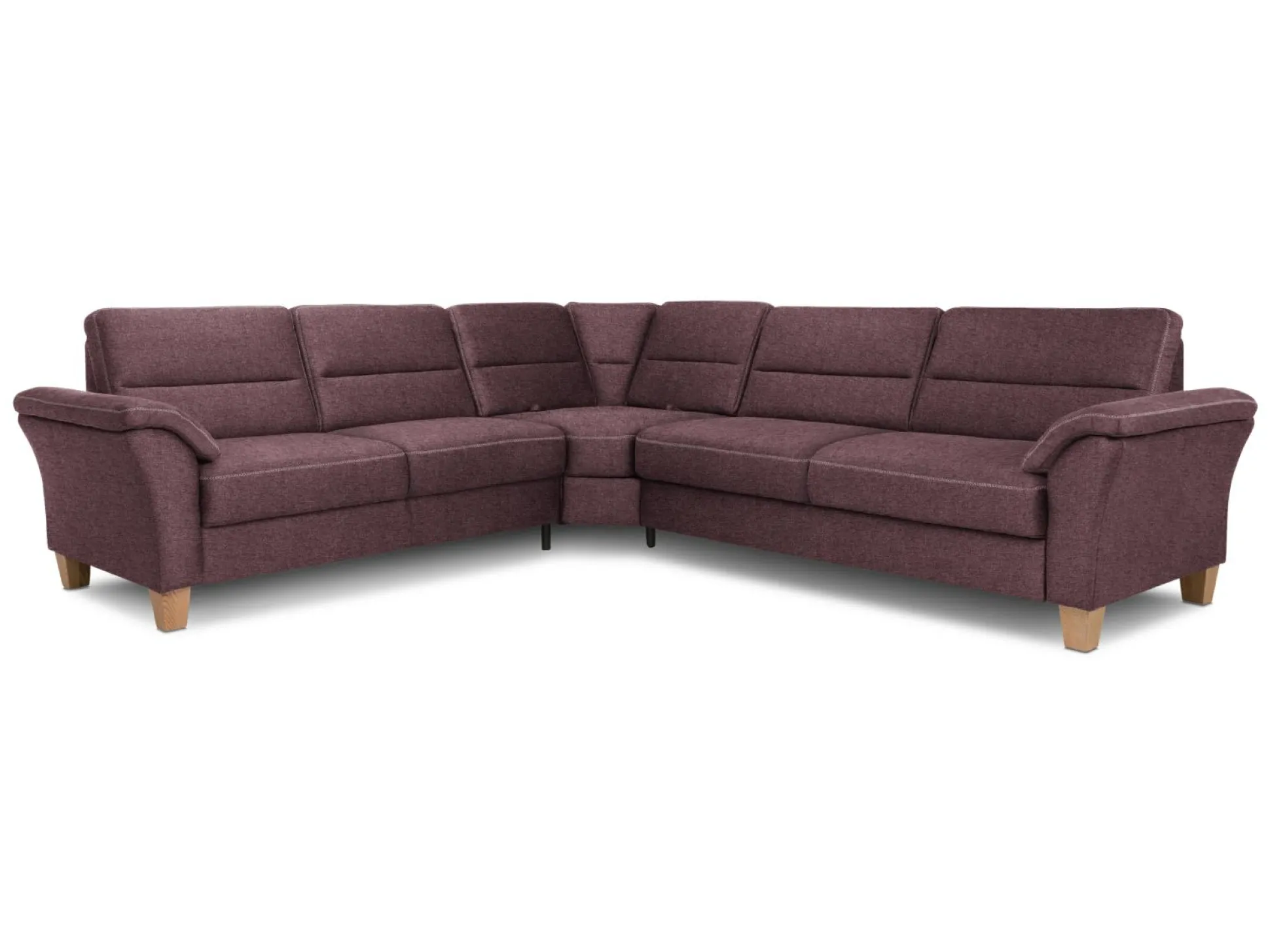Soleo,, Bezug: Stoff Basic Alvaro, Kreuznaht in beige, TKZ gem. Herstellerangaben, bestehend aus: 2,5 Sitzer Armteil vorstehend links, Trapezecke XL, 3 Sitzer Armteil vorsteh. rechts, Federkern im Sitz, Sitzhöhe/-tiefe c. 47cm/52cm, Holzfuß Buche massiv eichefarben, Rücken echt bezogen, Auf Wunsch: Bett, Relaxfkt., Kissen u. Kopfstützen, Sperriges Möbelstück
