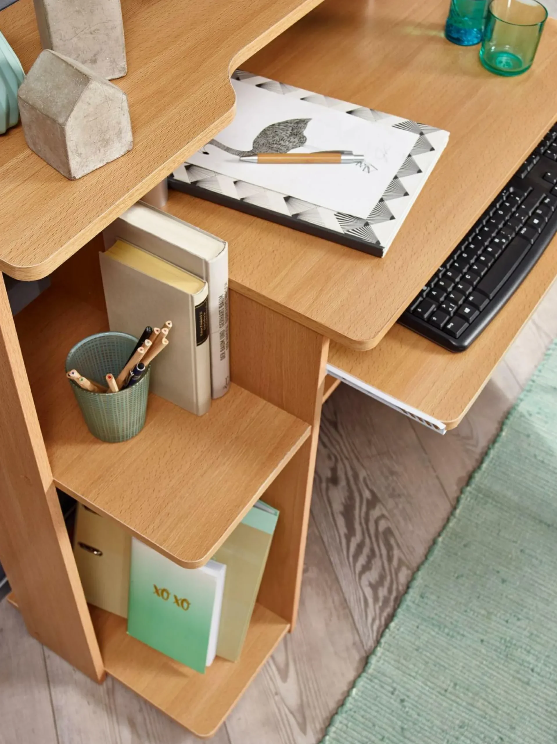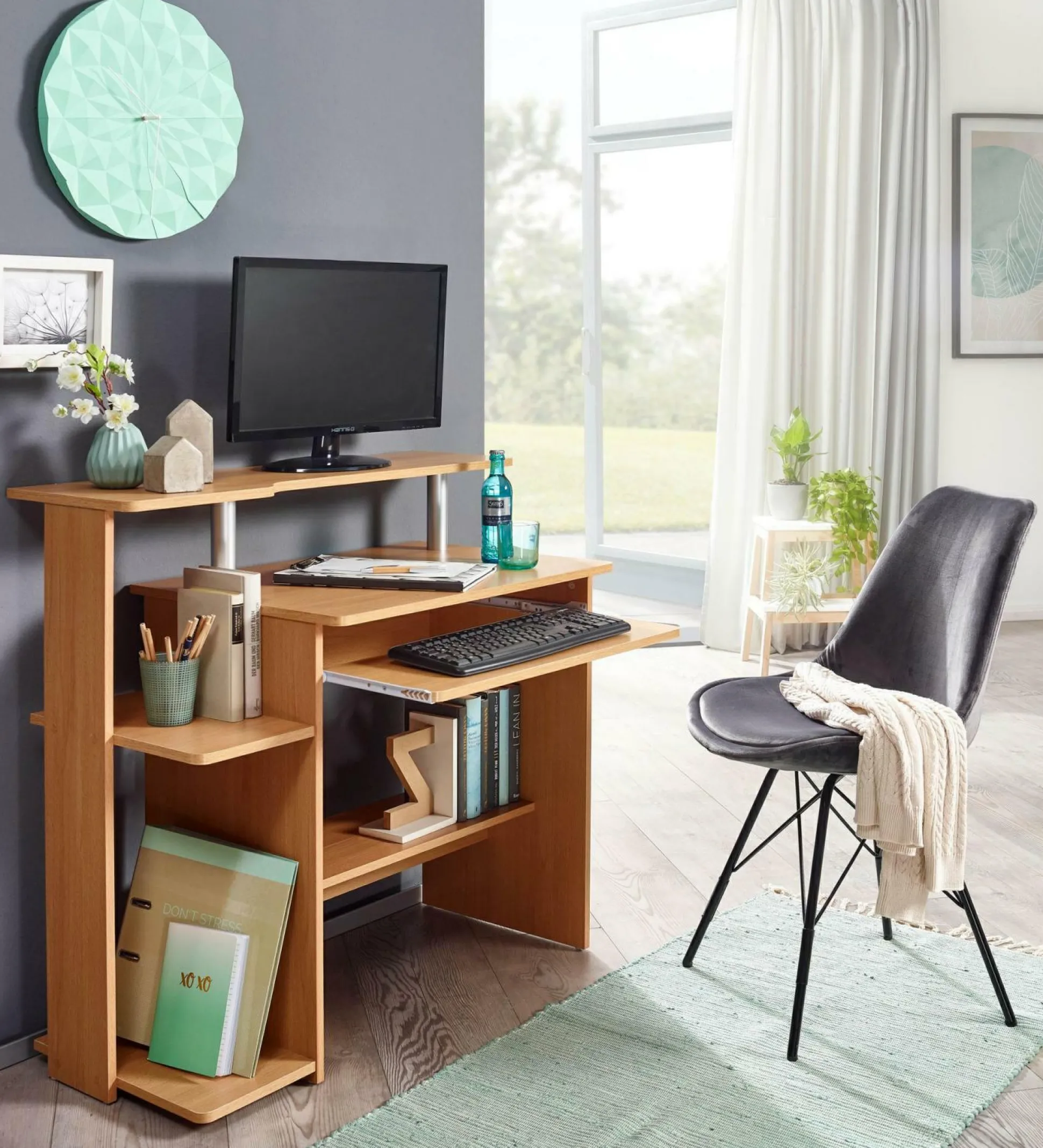 · Lieferumfang und Montage – Geliefert wird ein Computertisch ohne Dekoration. Montageanleitung, Montagematerial und -werkzeug werden mitgeliefert.