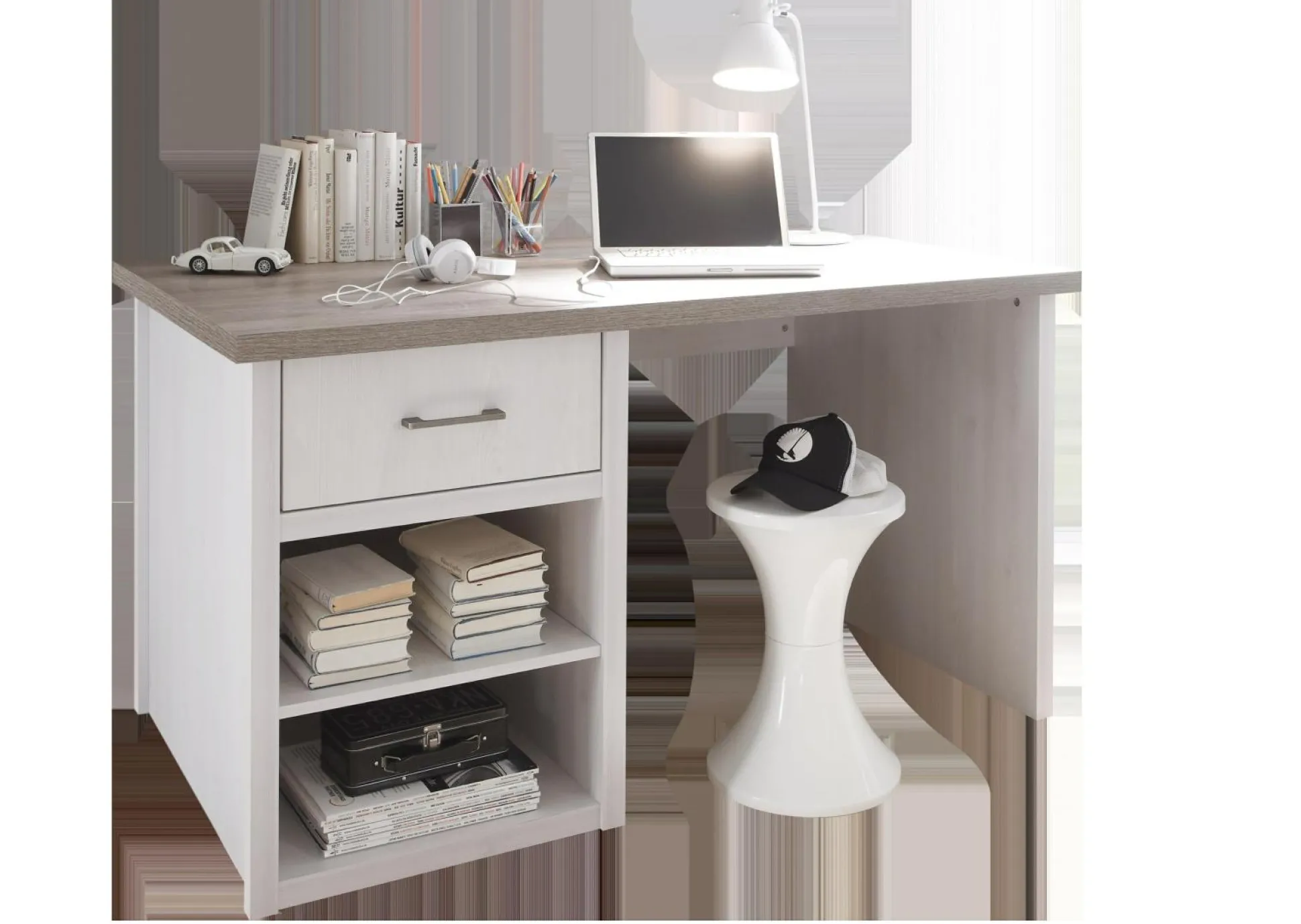 Schaffen Sie eine praktische Arbeitsfläche mit dem Schreibtisch Luca. Dieser Schreibtisch erscheint in Pinie Weiß mit einer Platte in Trüffel Dekor. Zwei Fächer sowie ein Schubkasten bieten Platz für Büro- und Arbeitsutensilien. Dabei lässt sich die Schubkasteneinheit je nach Wunsch rechts oder links montieren.