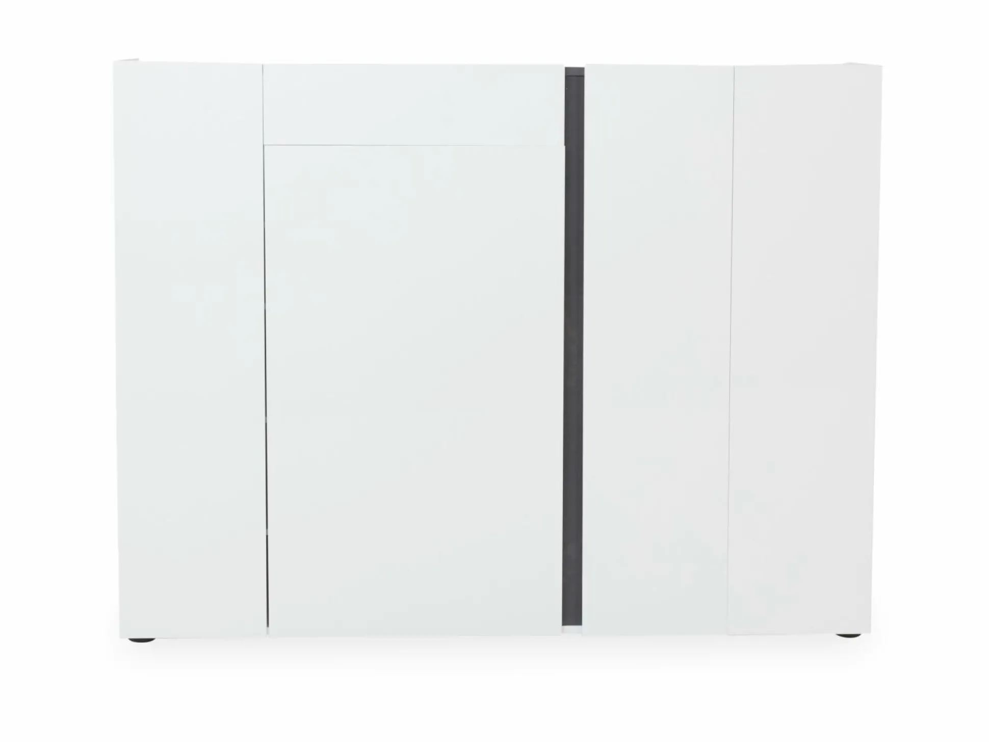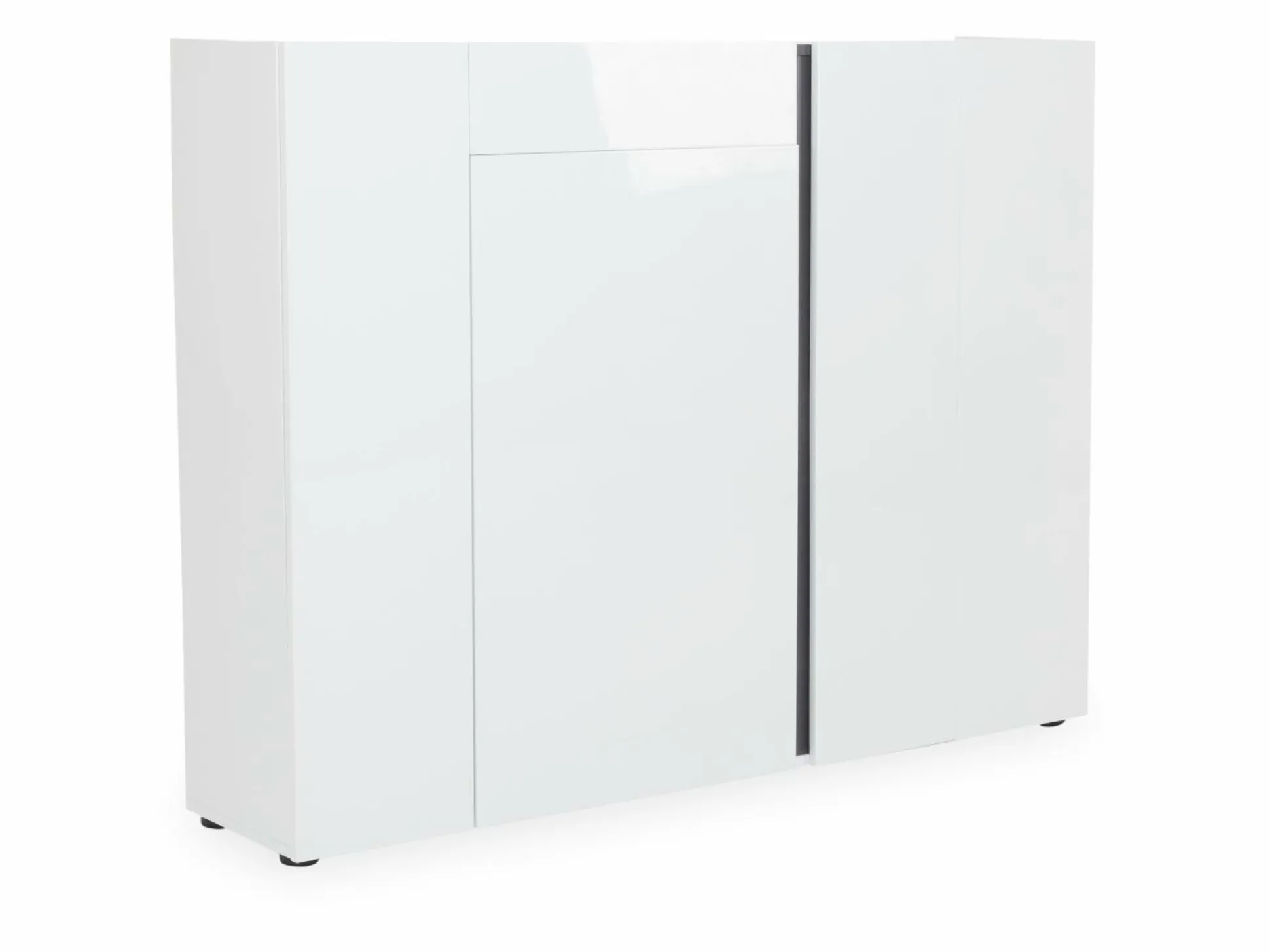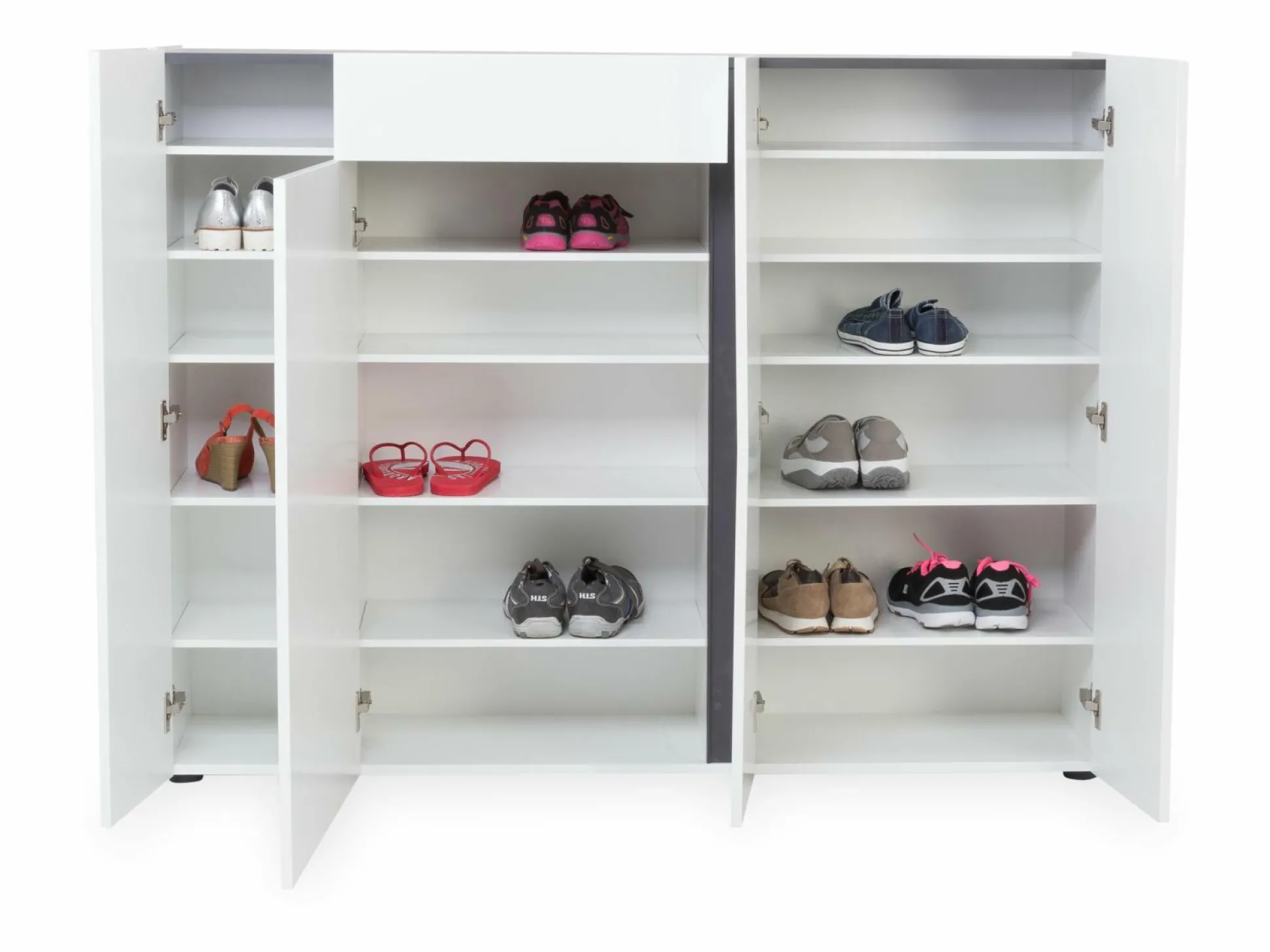 Der Schuhschrank ATRIUM ist die ideale Möglichkeit Platz und Ordnung in Ihrem Zuhause zu schaffen. Das schlichte, aber dennoch moderne Design integriert sich dabei in nahezu jedes Einrichtungskonzept. Front und Korpus sind aus Hochglanz weiß lackiertem Dekor gefertigt. Die Griffleisten in anthrazit schaffen dabei einen Kontrast, der das Design perfekt abrundet. Der Schrank kommt mit vier Türen (1x Anschlag rechts, 3x Anschlag links) und einer Schublade. Hinter den Türen befinden sich insgesamt 14 Einlegeböden (5x links, 4x mitte, 5x rechts). Die Türen sind mit Dämpfern und die Schublade mit Soft-Close ausgestattet.
