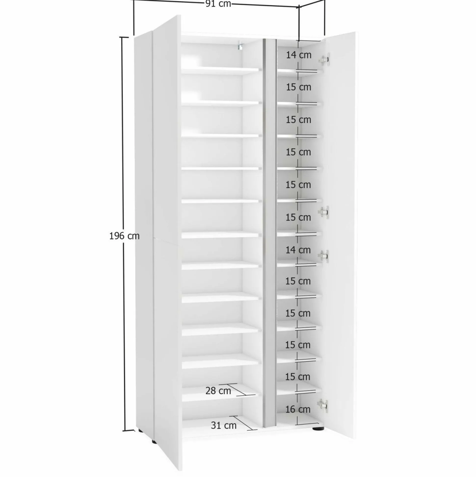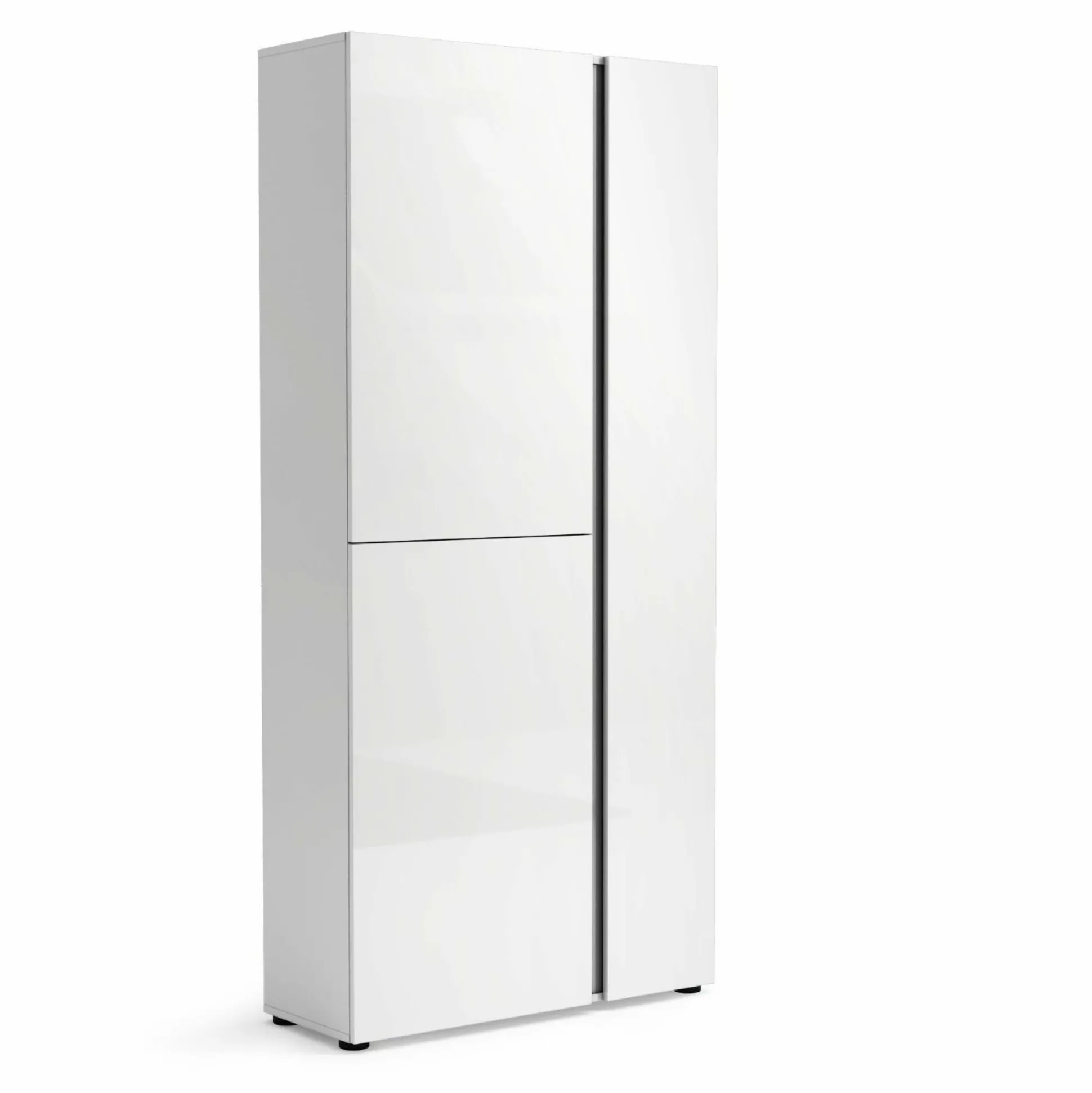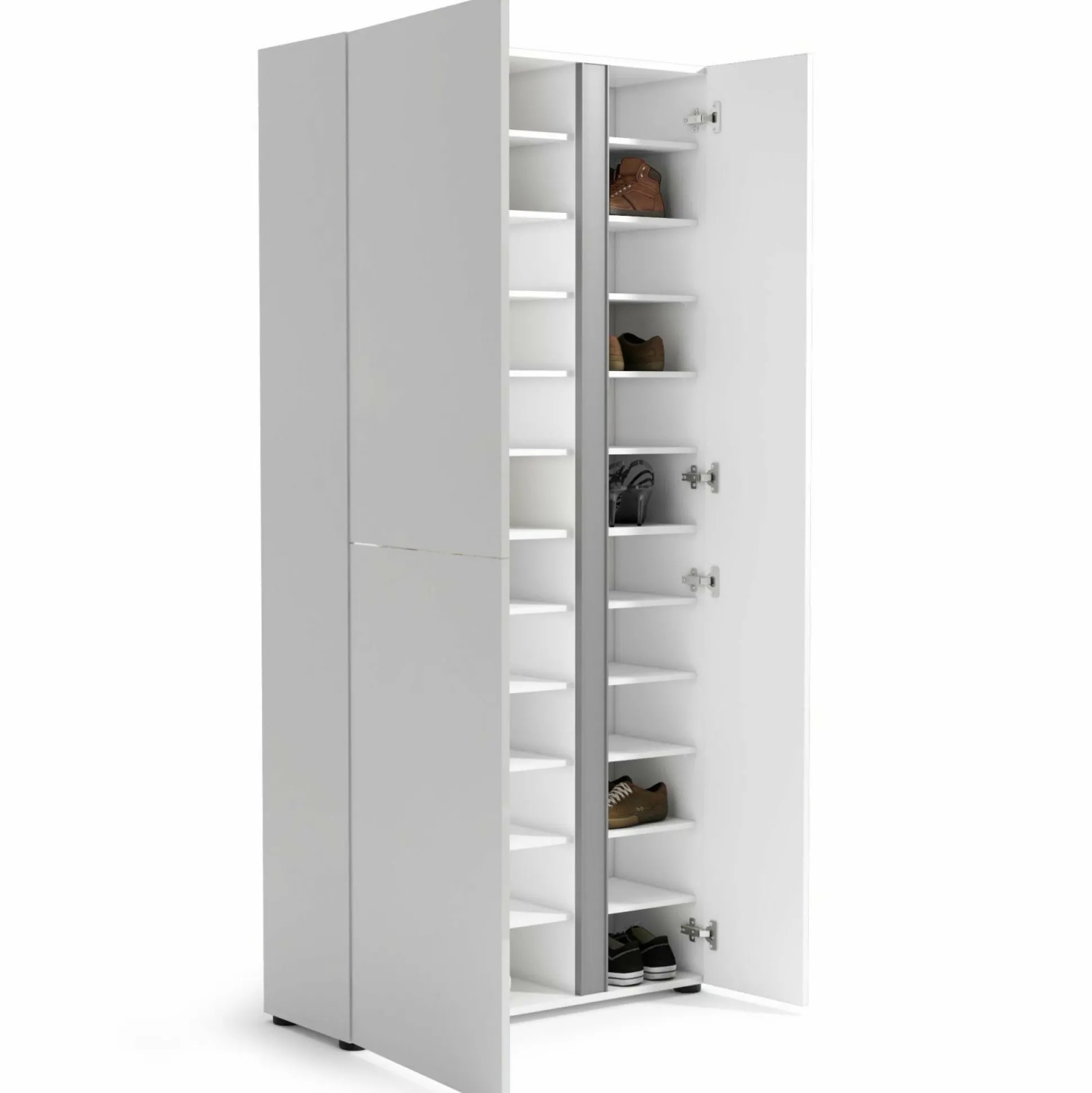 Der Schuhschrank ATRIUM ist die ideale Möglichkeit Platz und Ordnung in Ihrem Zuhause zu schaffen. Das schlichte, aber dennoch moderne Design integriert sich dabei in nahezu jedes Einrichtungskonzept. Front und Korpus sind aus Hochglanz weiß lackiertem Dekor gefertigt. Die Griffleisten in anthrazit schaffen dabei einen Kontrast, der das Design perfekt abrundet. Der Schrank kommt mit zwei Türanschlägen links und einem rechts, sowie vier Einlegeböden links und zehn Böden rechts. Die Türen sind mit D0ämpfern versehen und ermöglichen somit ein sanftes Schließen.