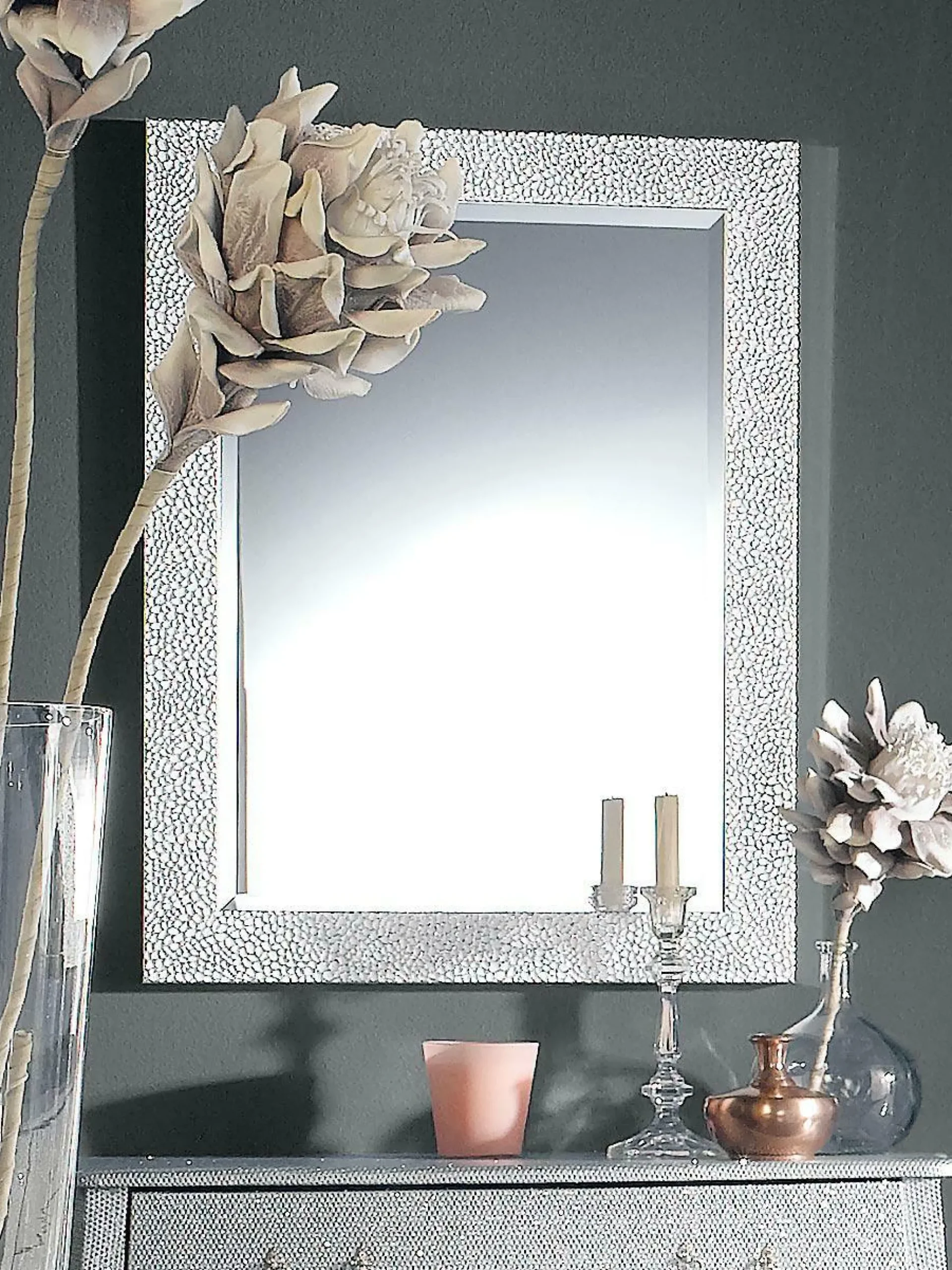 Einen extravaganten und schicken Akzent setzen Sie mit diesem schönen Rahmenspiegel. Der Spiegel ist mit einer edlen Facette ausgestattet und überzeugt dank des modern gestalteten Rahmens in Silber und Weiß. Die Oberfläche des Rahmens ist mit einer schönen Struktur versehen, welche den Spiegel zu einem echten Blickfang macht.