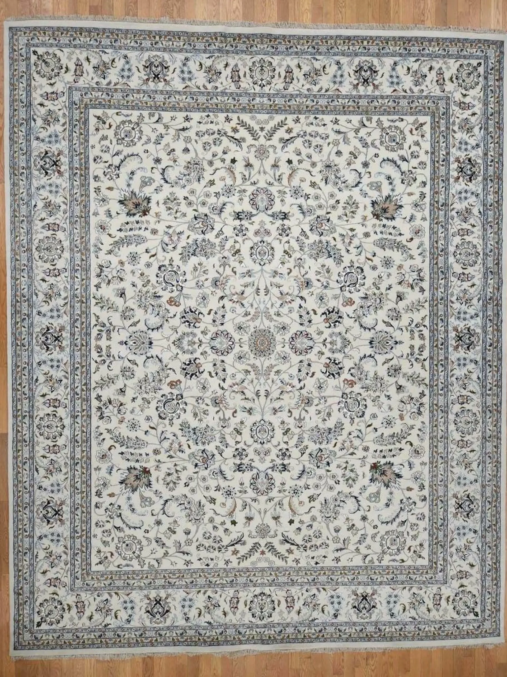 Mit dem Teppich ALLOVER setzen Sie einen stilvollen, klassischen Akzent in Ihrem Wohnraum! Insgesamt besteht der Teppich aus Schurwolle und Viskose in der Farbe Beige. Die Knoten per m² betragen 275.000. Dabei ist er mit detailreichen Blumen in verschiedenen Farben versehen. Durch das besondere Muster wird dieser Teppich zum optischen Highlight in Ihrem Zuhause!