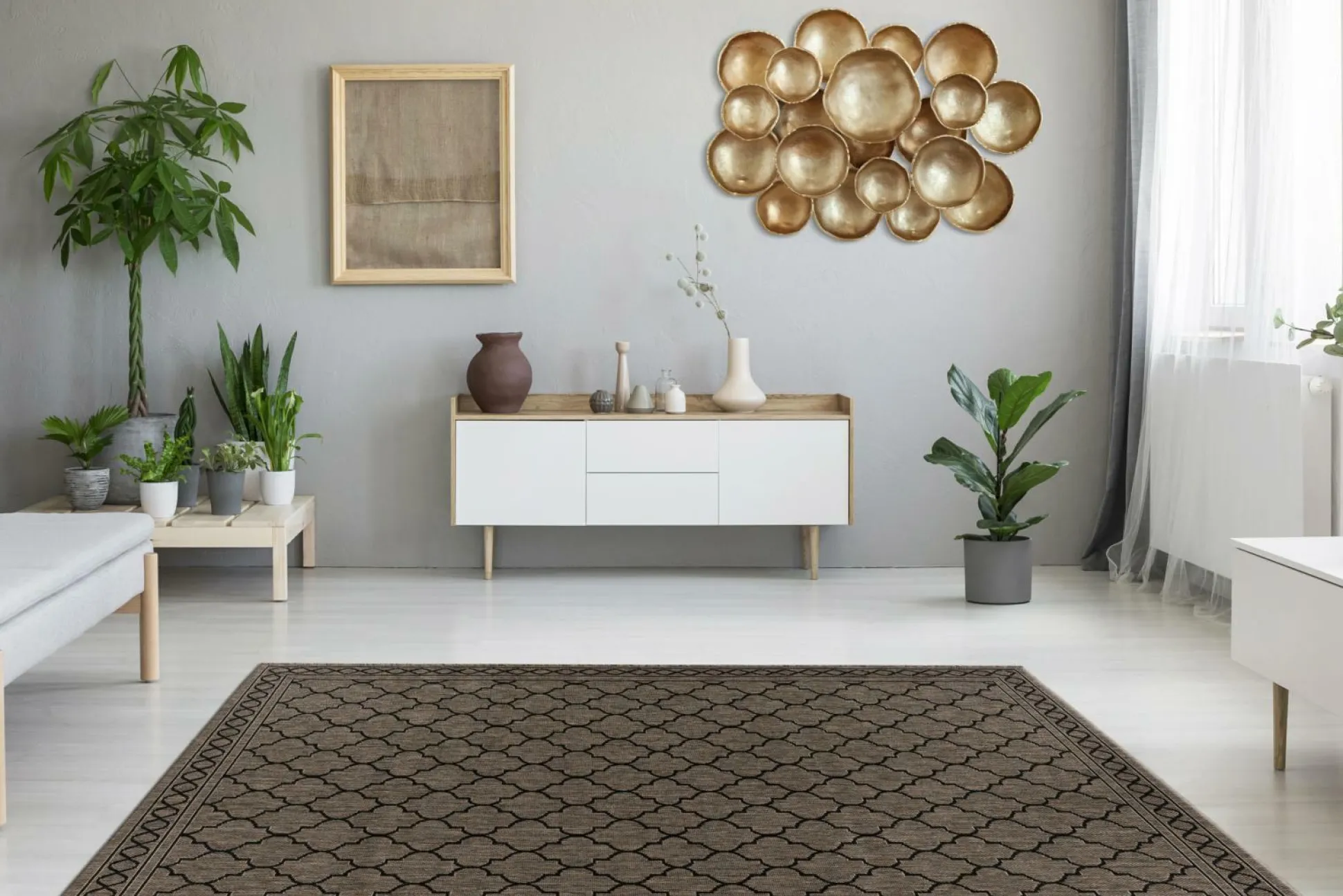 · Dieser robuste Teppich für den Außenbereich setzt mediterrane Akzente in jeden Wohnbereich. Der Flachgewebeteppich mit dezenter Farbgebung schafft durch das moderne Design ein gemütliches Ambiente in jedem Außenbereich. Dank seiner feuchtigkeitsbeständigen Kunstfaser aus Polypropylen ist er wasserabweisend und wetterfest. Außenbereiche können mit ihm als Läufer oder Auslegteppich das ganze Jahr über verschönert werden. Werten Sie die Möbel auf Ihrem Balkon auf, indem Sie den Teppich darunter platzieren oder gestalten Sie ausgewählte Bereiche Ihrer Terrasse wohnlich. Kombiniert mit modernen Loungemöbeln oder Sitzelementen und Beistelltischen schafft der Teppich ein gemütliches Ambiente, welches durch Kerzen und Lichterketten ergänzt werden kann. Ob auf Balkon, Terrasse oder Hof, der Outdoor Teppich ist überall gern gesehen und kann selbstverständlich ebenso im Wohnraum ausgelegt werden. Lassen Sie die Sommerabende mit diesem Teppich in Ihrem Außenbereich ausklingen!