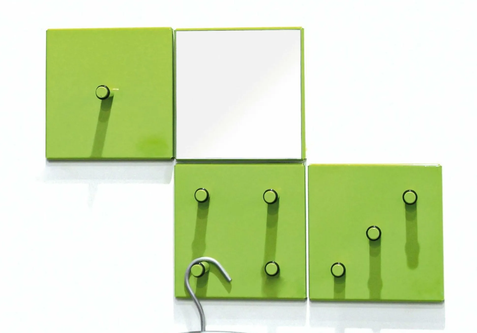 Mit diesem Garderobenset sind Sie bestens ausgerüstet. Dieses vierteilige Set besteht aus einem Wandspiegel sowie einem 1er, 3er und 4er Garderobenhaken, sodass eine Menge Jacken oder ähnliches aufgehängt werden kann. Sämtliche Elemente sind aus grün lackiertem Metall gefertigt.