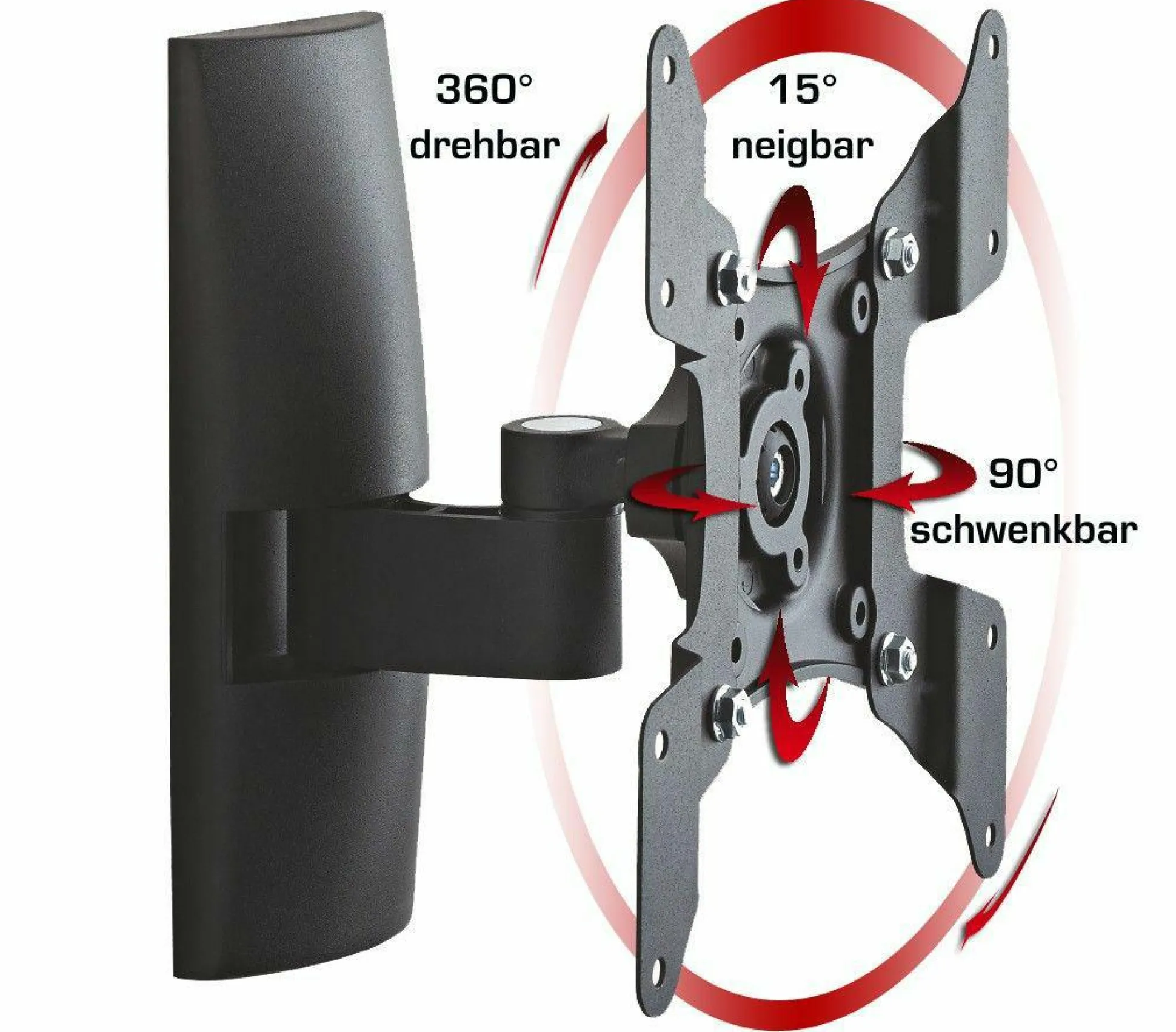 · VCM universelle Wandhalterung TS 1 Schwarz aus hochwertigem Aluminium. Für alle handelsüblichen Flachbildschirme von 15-37 Zoll (38-94 cm) bis max. 20 kg. Die Halterung hat 1 Gelenk. Wandabstand min. 8,8 cm max. 15,5 cm. Die Halterung ist 15 Grad nach oben und unten neigbar, hat einen Schwenkradius von bis zu 90 Grad seitlich und ist um 360° drehbar und somit auch im Portaitformat verwendbar. VESA-kompatibel mit 75×75,100×100, 100×200, 200×100 und 200×200 mm. Die Lieferung erfolgt teilmontiert inklusive aller Befestigungsmaterialien und Montagematerial. Produktmaße: Länge/Breite 22,0 x Tiefe 15,5 cm.