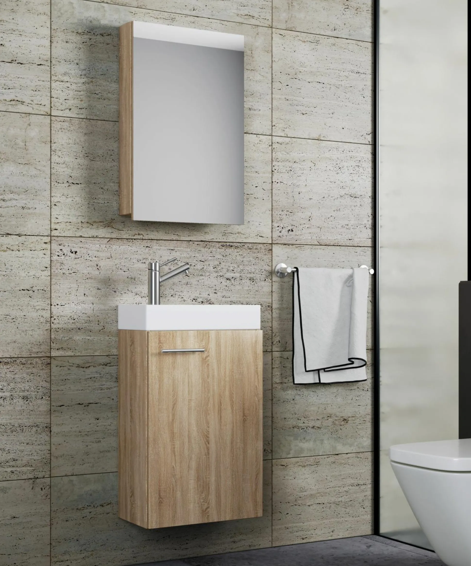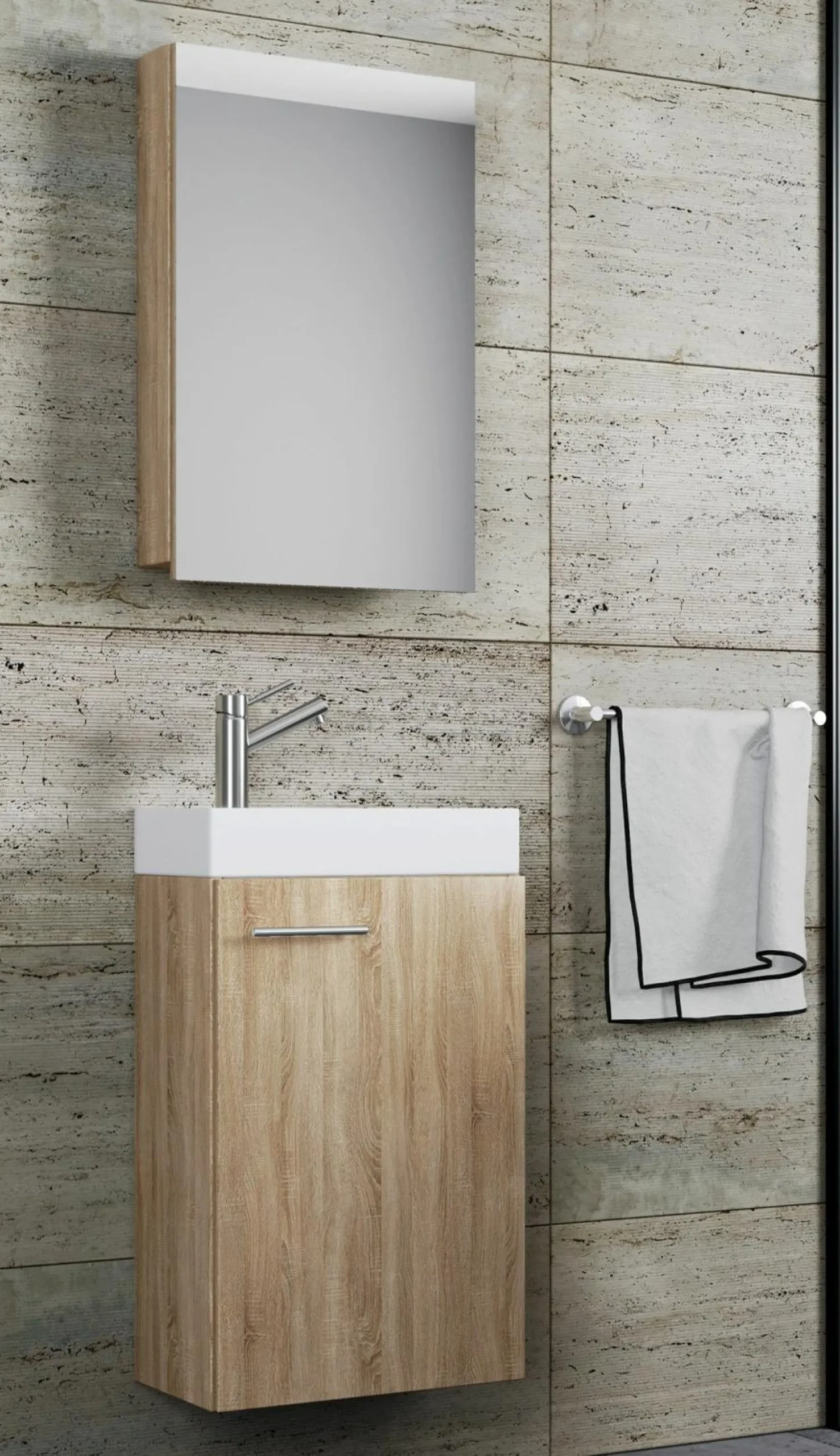 · Das moderne Bad-Set Slito mit Spiegelschrank eignet sich für ein Gäste-WC oder kleines Bad.
