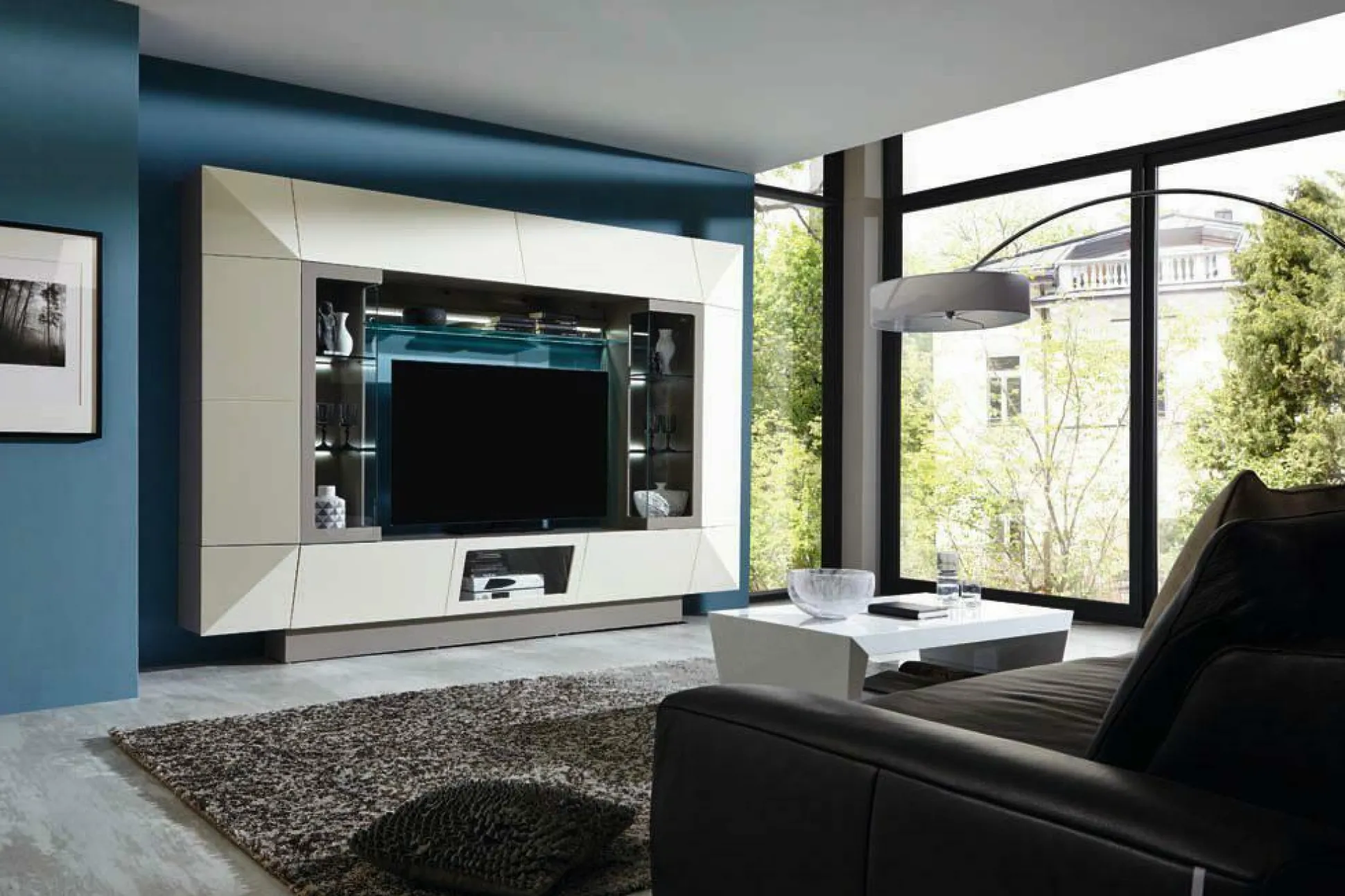 Design und Qualität auf höchstem Niveau bietet Ihnen die Wohnwand Prisma Plus von MONDO. Die hochmoderne Wohnwand überzeugt durch ihre außergewöhnliche Gestaltung in Form und Farbe. Die Kombination aus dem Korpus, der Vitrinenfronten und dem Sockel in Taupe matt Lack und der Fronten in Perlweiß Lack Hochglanz ist besonders edel und schafft eine stilvolle und zugleich trendbewusste Wohnraumatmosphäre. Prisma Plus besteht aus einem Hängemodul rechts und links mit je drei Türen, einem Hängemodul oben und unten mit je zwei Türen, ausgestattet mit zwei Holztüren und einer Glastür, einem Einsatzmodul rechts und links mit je einer Tür sowie einem Winkelboard mit Glasablage und einem Sockel.