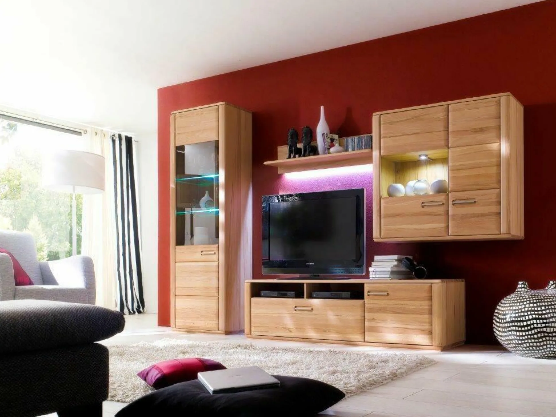 Front: Kernbuche massiv geölt Korpus: außen Kernbuche furniert geölt / innen Kernbuche Nachbildung Frontglas in Parsol braun Glasböden 8mm Klarglas Schubkästen und Glastüren gedämpft >>> Preis ohne Beleuchtung <<>> Maße ca. Montagemaße <<<