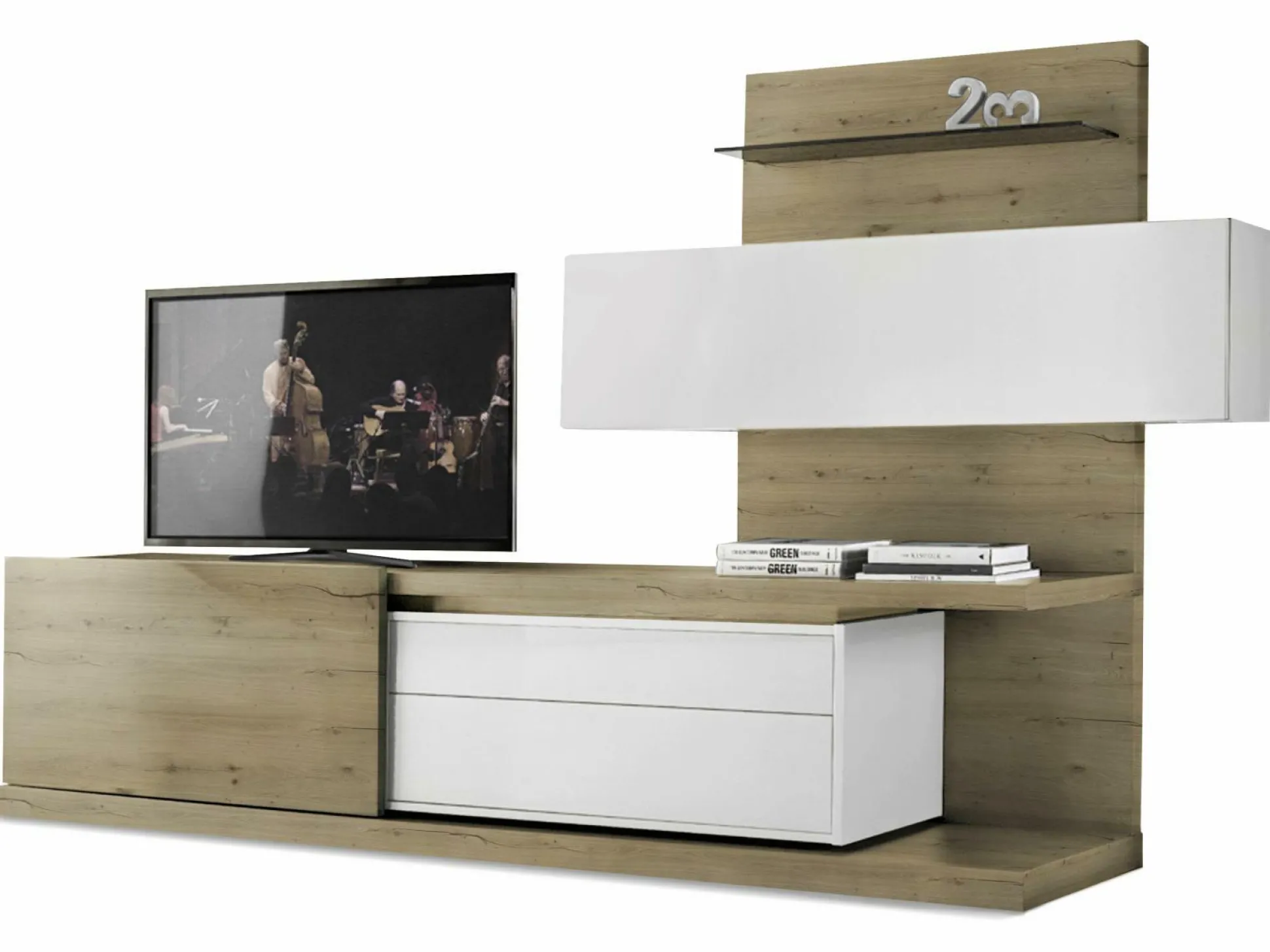 · 1x Lowboard mit 1 Schiebetür links mit 1 Glasboden dahinter, 2 Schubladen vorstehend rechts